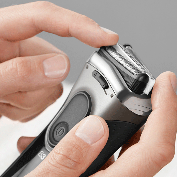 網刃ロックスイッチ 片方の網刃を一時的に引っ込ませることで、鼻の下などの剃りにくい部分も簡単に剃ることができます。